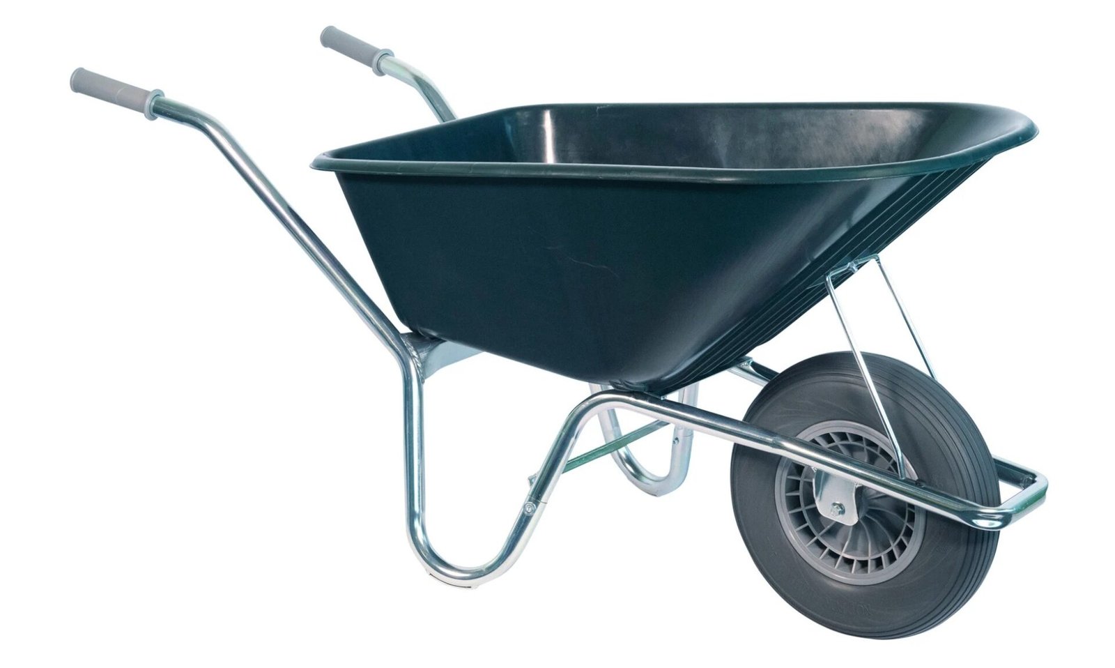 De bak is een kunststof PP rondneus bak van 100 liter. Het is een tweedelig frame van premium grijs verzinkte ronde buis en voorzien van slijtsloffen. Deze kruiwagen is ook te verkrijgen met een anti-lekwiel. Wiel met 4ply band, kunststof velg, kogellagers en binnenband.