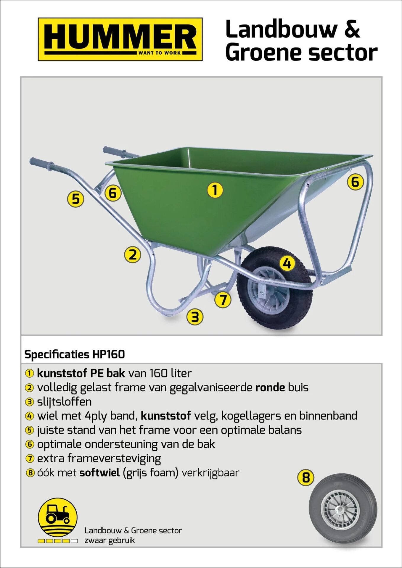 Kunststof PE bak 160 liter. Volledig gelast frame van gegalvaniseerde ronde buis en voorzien van slijtsloffen. Wiel 400×8 4ply met kunststof velg, kogellagers en binnenband. Frame is volledig gelast.