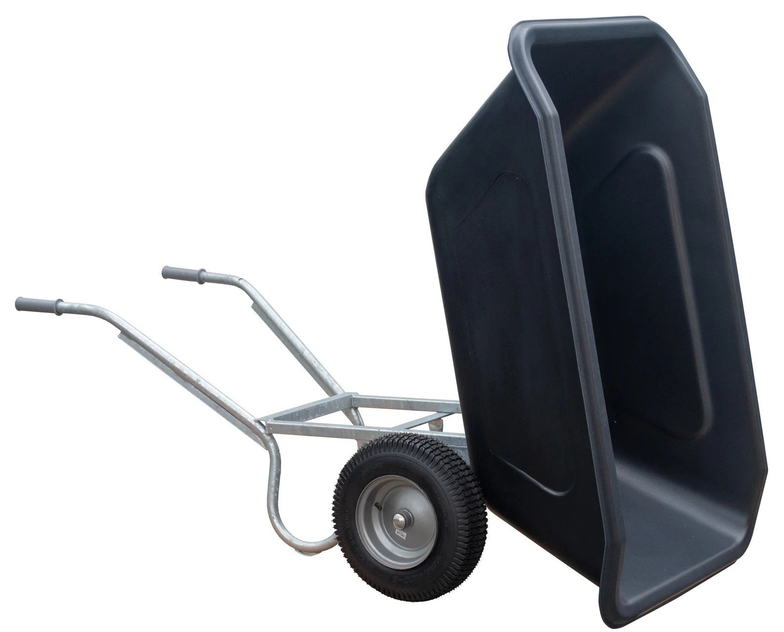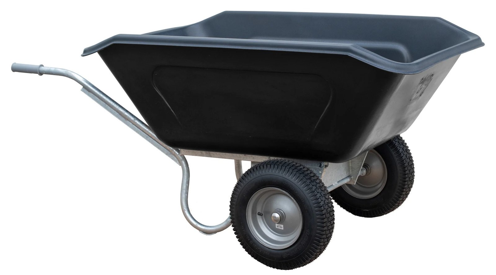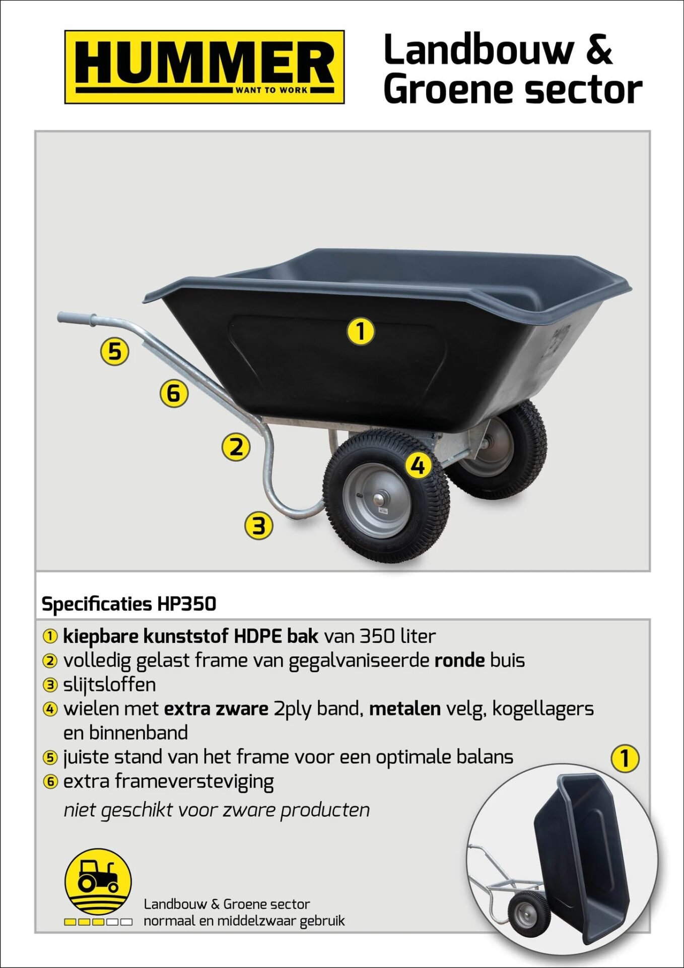 Kunststof HDPE bak 350 liter, formaat 140x85x45 cm (lxbxd). Volledig gelast frame van gegalvaniseerde ronde buis, voorzien van slijtsloffen en met kiepbare bak. Wielen 400×8 4ply extra zwaar met metalen velg, kogellagers en binnenband. Frame is volledig gelast. Niet geschikt voor zware producten.
